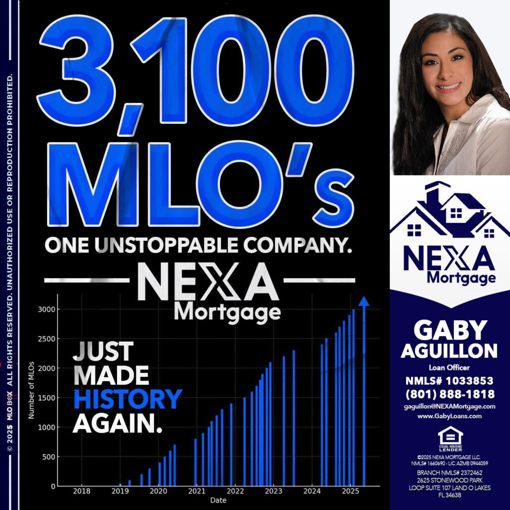3,100 MLO´s - Gaby Aguillon -Loan OfficerHi, my name is Gaby Aguillon. I’m a Loan Officer with NEXA Mortgage LLC., offering personalized mortgage solutions, fast customized quotes, great rates and service with integrity.