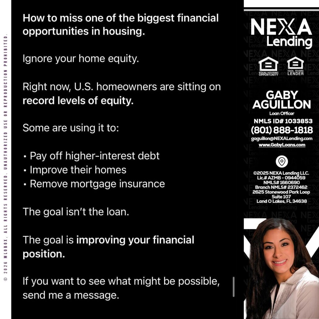 Hi, my name is Gaby Aguillon. I’m a Loan Officer with NEXA Lending LLC., offering personalized mortgage solutions, fast customized quotes, great rates and service with integrity.