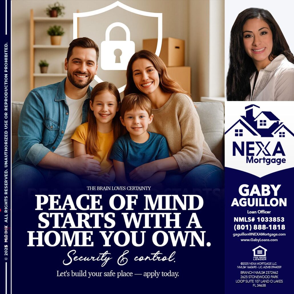 peace of mind - Gaby Aguillon -Loan OfficerHi, my name is Gaby Aguillon. I’m a Loan Officer with NEXA Mortgage LLC., offering personalized mortgage solutions, fast customized quotes, great rates and service with integrity.