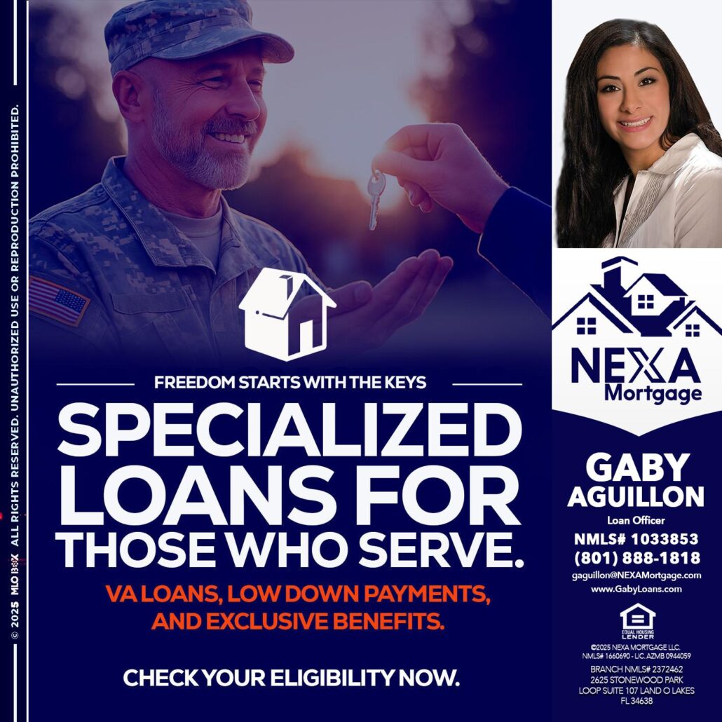 SPECIALIZED LOANS - Gaby Aguillon -Loan OfficerHi, my name is Gaby Aguillon. I’m a Loan Officer with NEXA Mortgage LLC., offering personalized mortgage solutions, fast customized quotes, great rates and service with integrity.