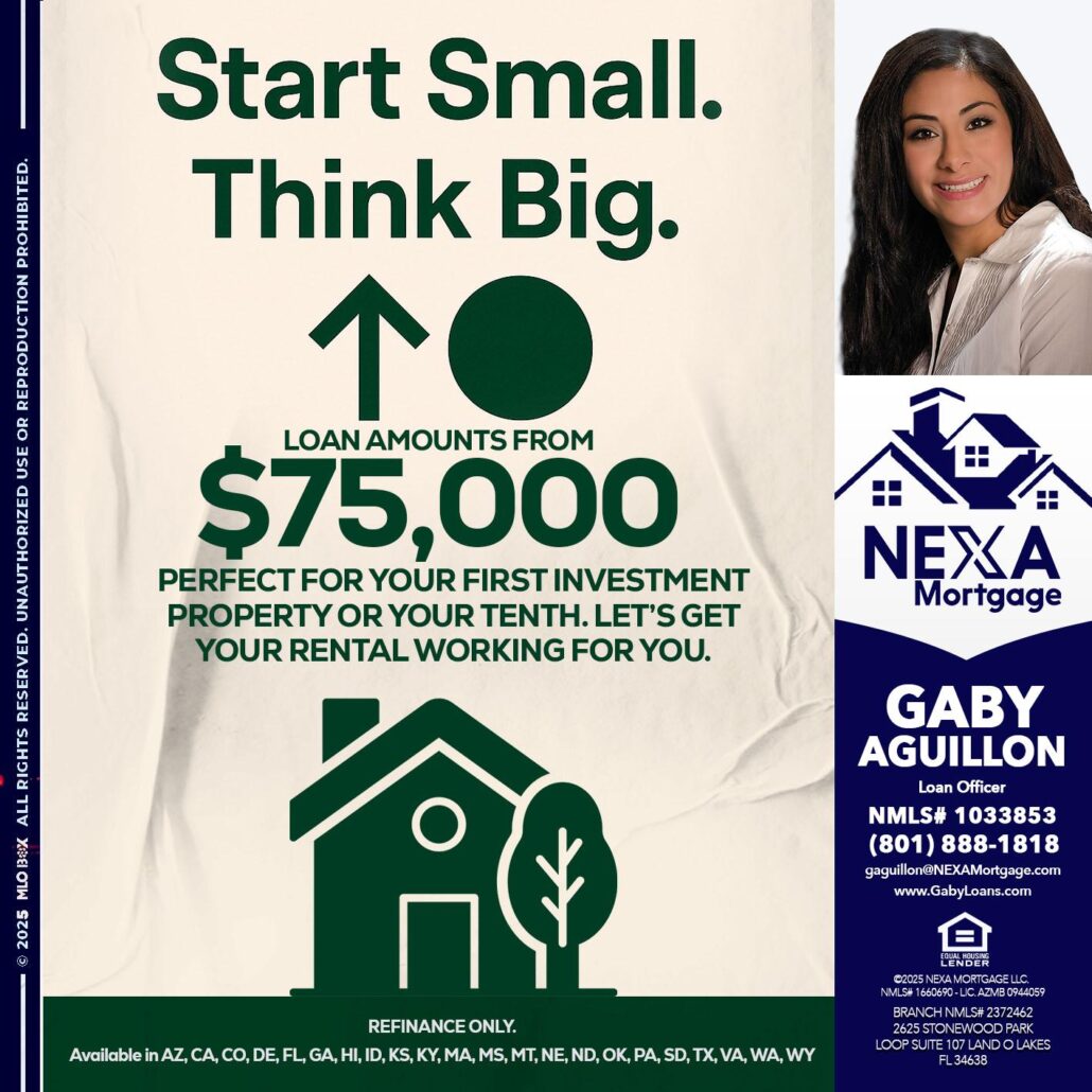 START SMALL - Gaby Aguillon -Loan OfficerHi, my name is Gaby Aguillon. I’m a Loan Officer with NEXA Mortgage LLC., offering personalized mortgage solutions, fast customized quotes, great rates and service with integrity.